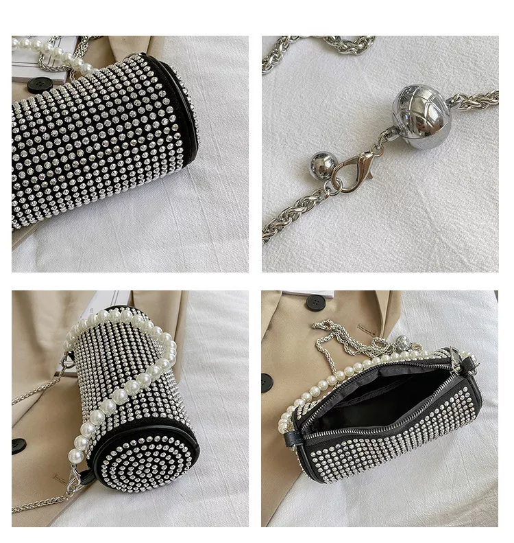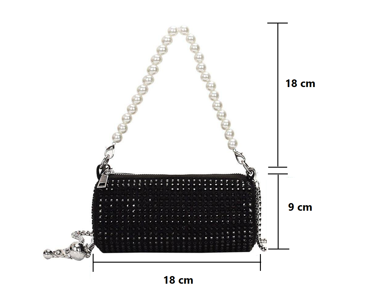 Dos correas desmontables, corta detalles perlas y correa larga tipo cadena plata.