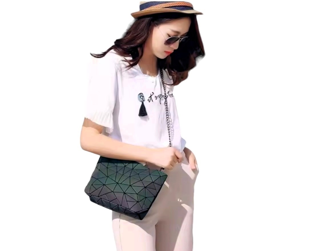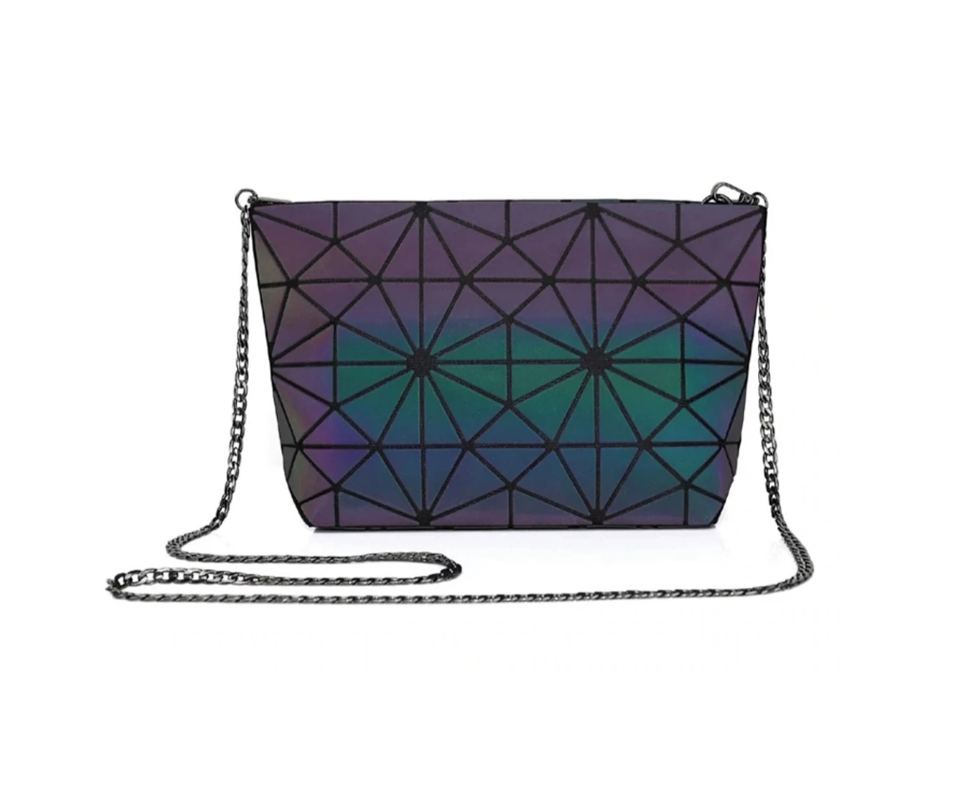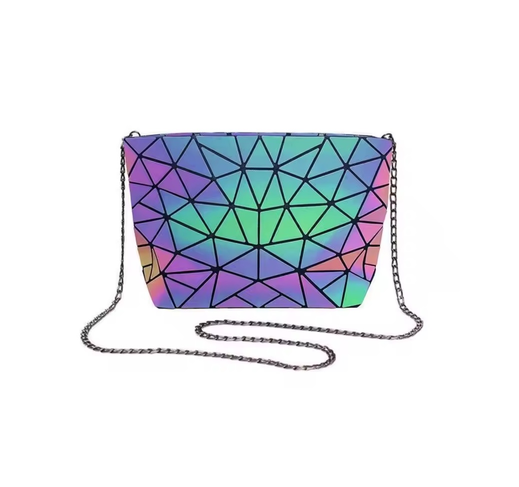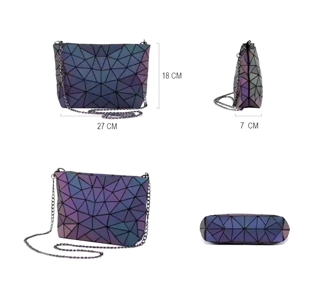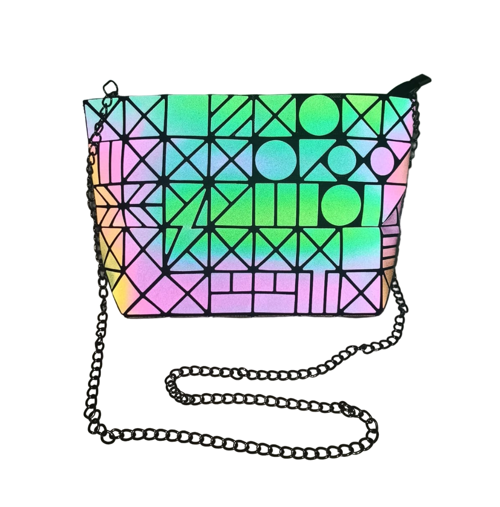 BOLSO GEOMETRICO LUMINOSO. FORRO EN SU INTERIOR, 3 COMPARTIMENTOS CHICOS.