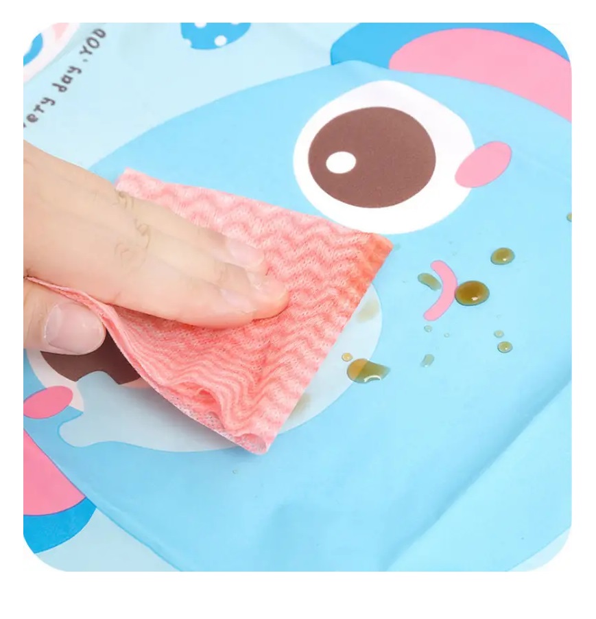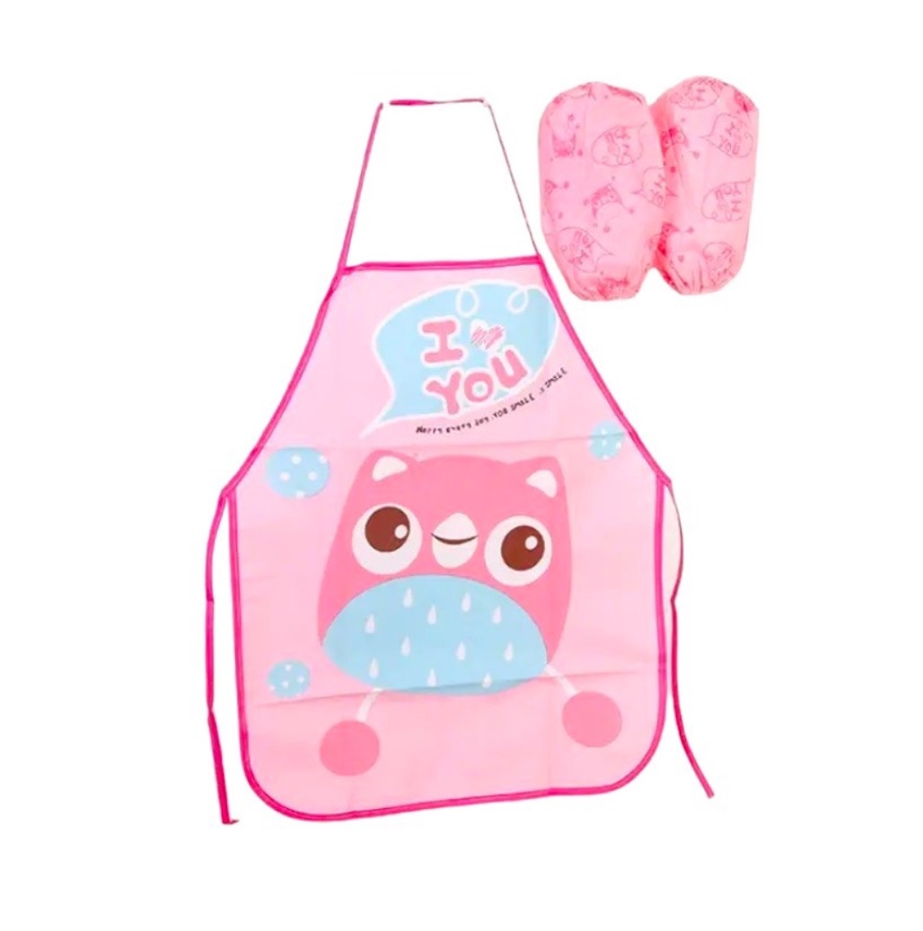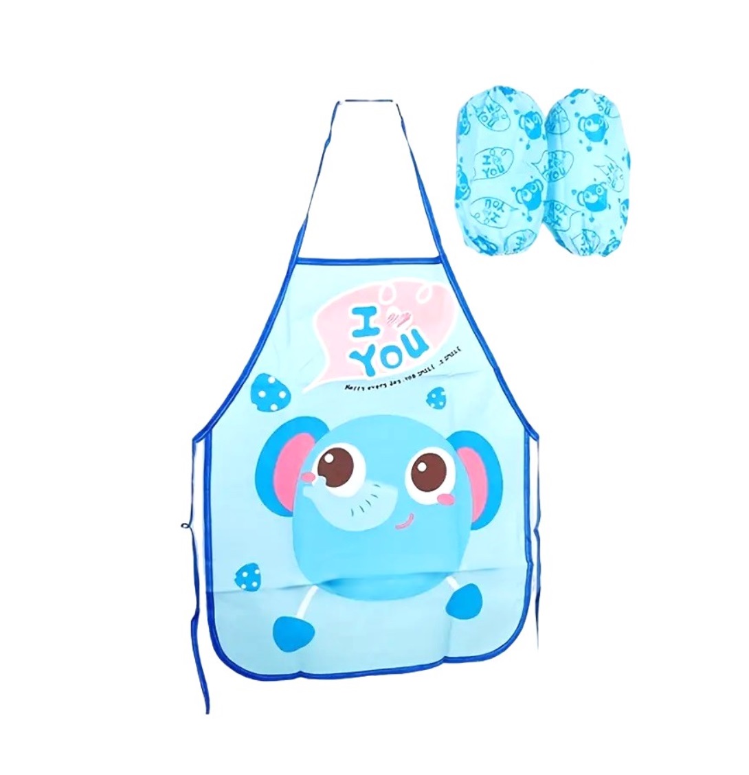 DELANTAL INFANTIL PLASTIFICADO, INCLUYE MANGAS. MEDIDA 50 CM X 39 CM.